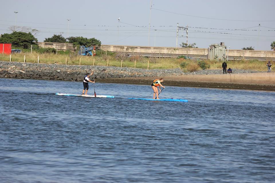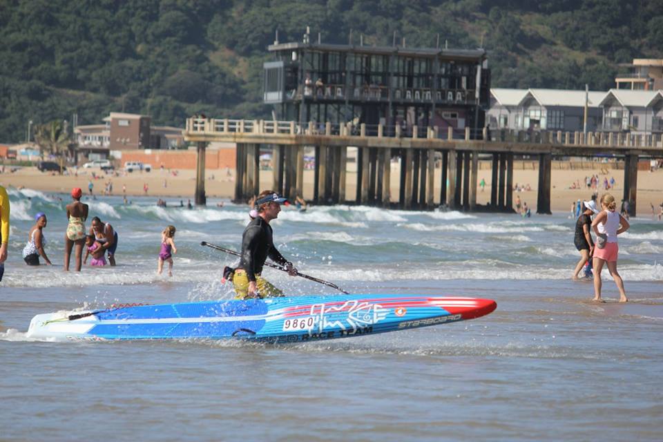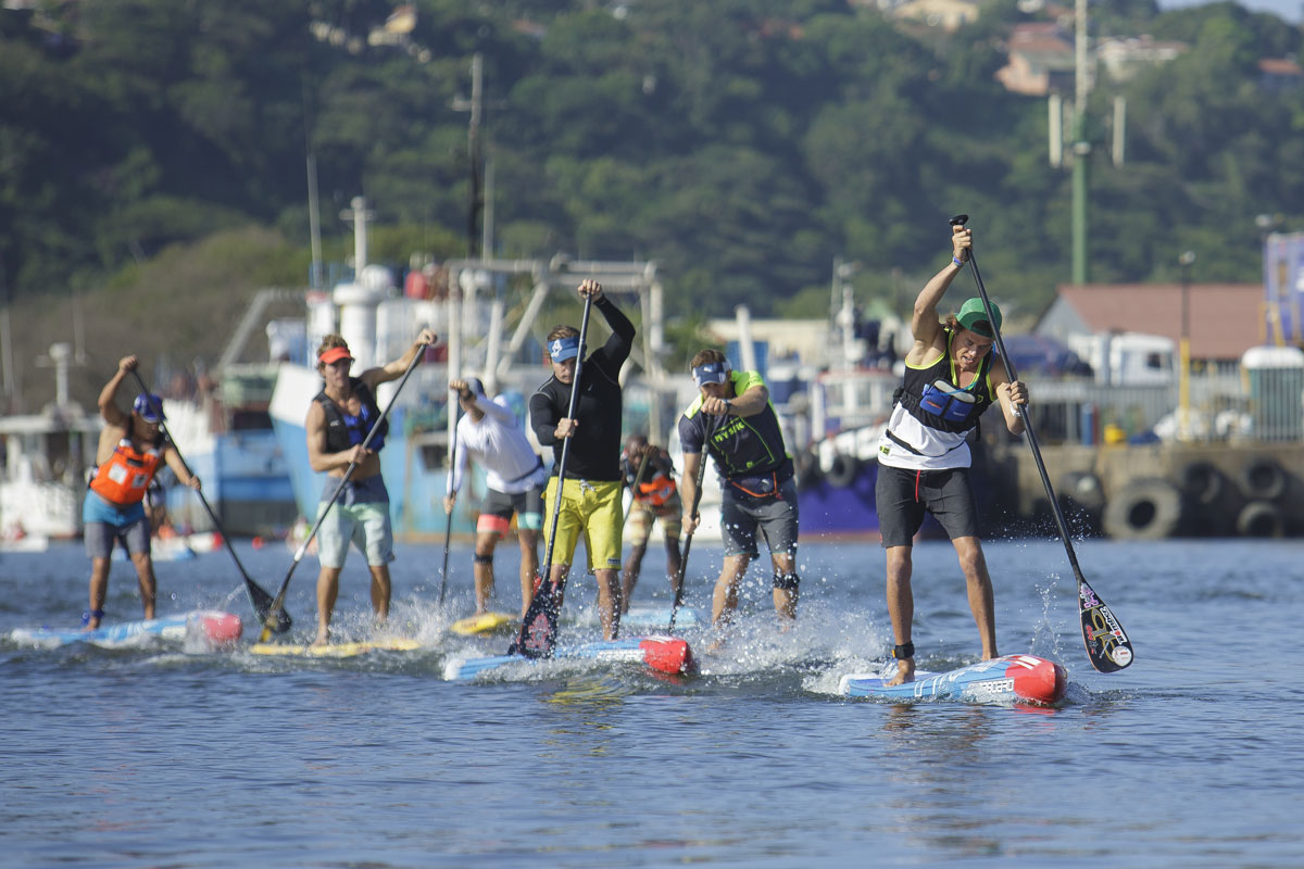 The race started at the old Stella Canoe Club, well up the harbour channel. A gentle but steadily building Northerly onshore wind had begun to blow at he start of the SUP race which meant the race was directly into a headwind through the harbour bay, making very tough paddling for any SUP paddler. Fortunately, not all was lost as the tide was pushing out so there was a fast current pulling the paddlers out the channel until they hit the open ocean. The men’s race started fast with Dylan taking up the front of the wave train with Chris in 2nd spot and Durbanite Daryl Batho in 3rd, after that with the main field all fighting for a position. Not long after the start the wave train broke up leaving just Chris and Dyl working out it in front together, taking turns pulling with Daryl in his own between them and the next train, being pulled by Gunter Berger and the remainder of the field on his wave. As the field neared the harbour mouth, the full force of the Northerly wind had picked up and conditions going out became very rough with a strong headwind of 12-15knots blowing with some choppy wind swell underfoot. Dylan exiting the harbour mouth in first place with Chris now off his wave, but still pushing hard very close behind. The tough conditions meant that the wave trains broke up and it was every man for himself. Paddlers then B-line for the the beach finish in front of Durban Surf Lifesaving Club, at Veggies Beach. The swell was small but the still steadily building onshore wind meant that the SUPs were left paddling through trying & choppy conditions fighting a side wind all the way to the beach. After rounding the final turn can anchored not far behind behind a small surf break, SUPs caught a final wave onto the beach and finished with a short run up the beach with board and paddle in hand. Dylan won the men’s elite 14ft class in 1:04 and Chris in 1:05 and Daryl finishing up podium spot 3mins behind Chris.